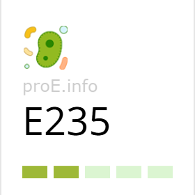 Натамицин или пимарицин (пищевая добавка Е235) – штамм, производимый в процессе ферментации бактериями Streptomyces natalensis. Добавка Е235 слабо растворима в спирте и воде. Однако натамицин является достаточно эффективным при очень низких концентрациях. По своей природе, натамицин является естественным противогрибковым агентом и используется в пищевой промышленности в качестве добавки-консерванта Е235.